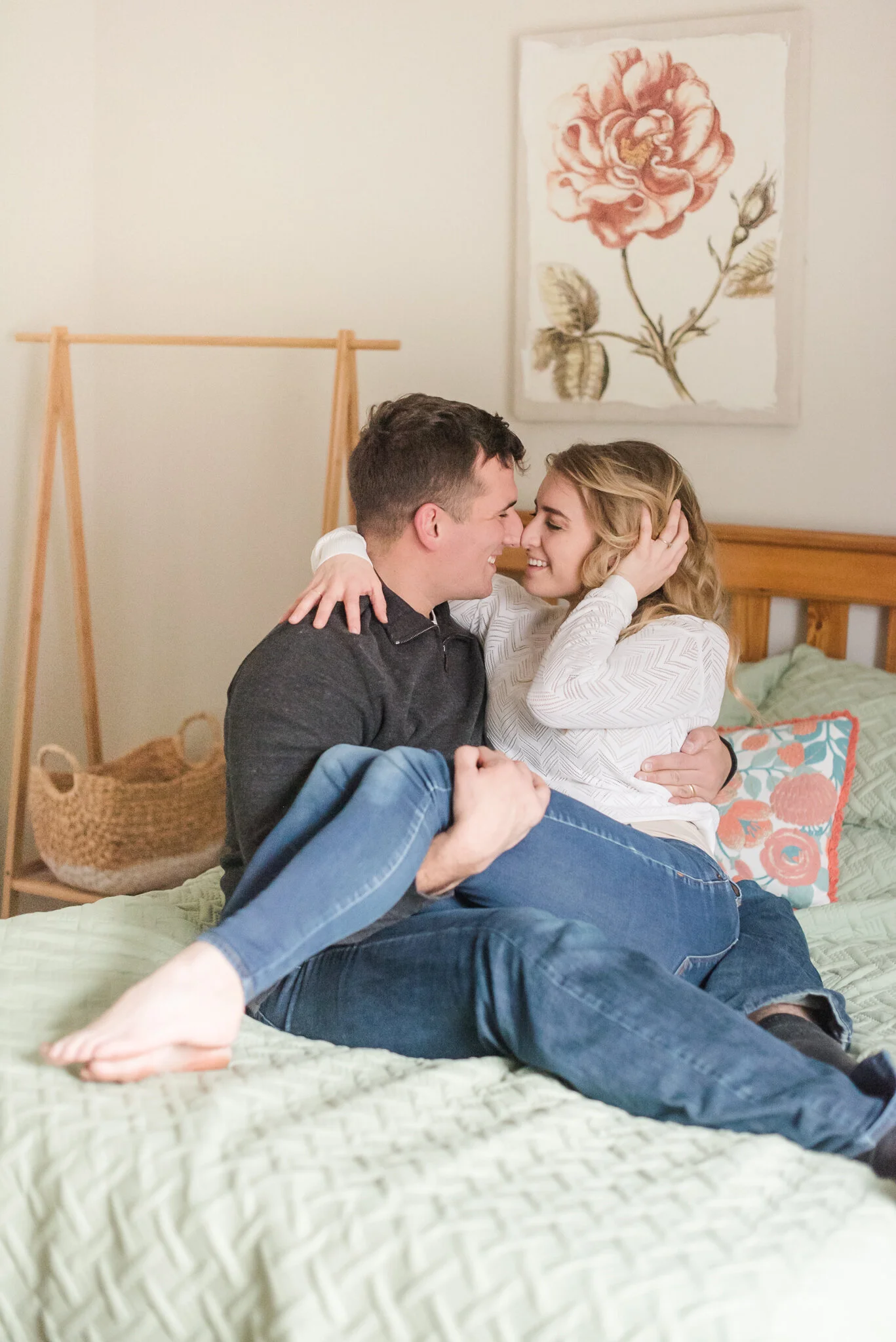 I was lucky enough to get to photograph both Jack and Hannah’s engagement session and their wedding as well. At this point, they are so comfortable in front of my camera that this cozy session was perfect. They were relaxed and in their element in their beautiful house, all decorated for the holidays. We took photos all around their home, in their living room with their Christmas tree (and all of the presents underneath), in their beautiful white (and super photogenic) kitchen, and in their master bedroom and guest bedroom. Their rent out their guest bedroom as an airbnb, so it was perfect for photos.