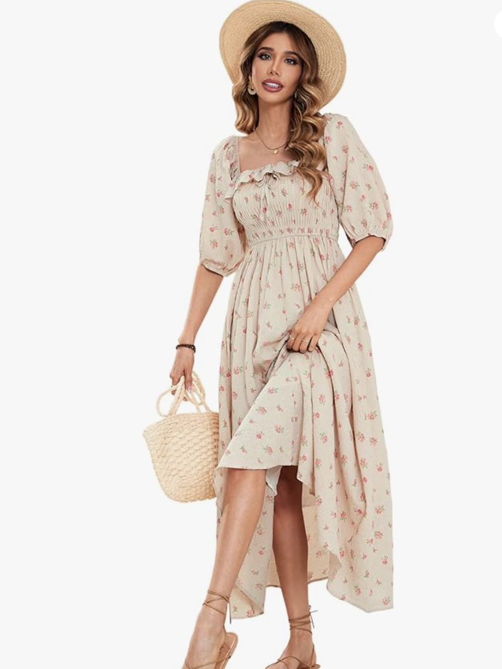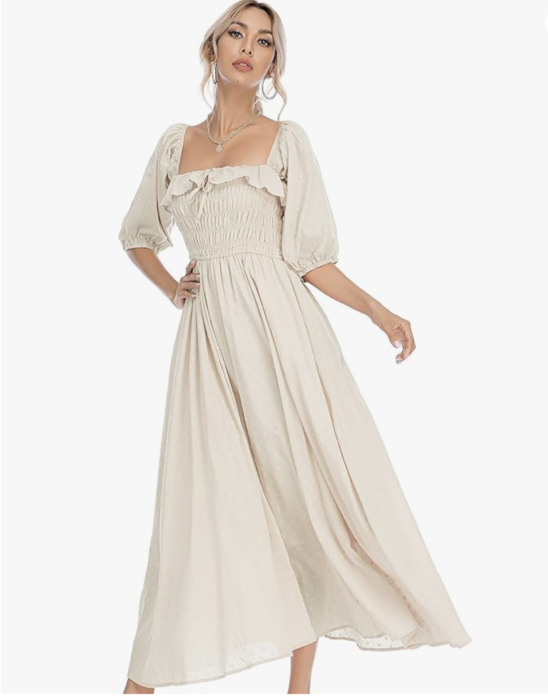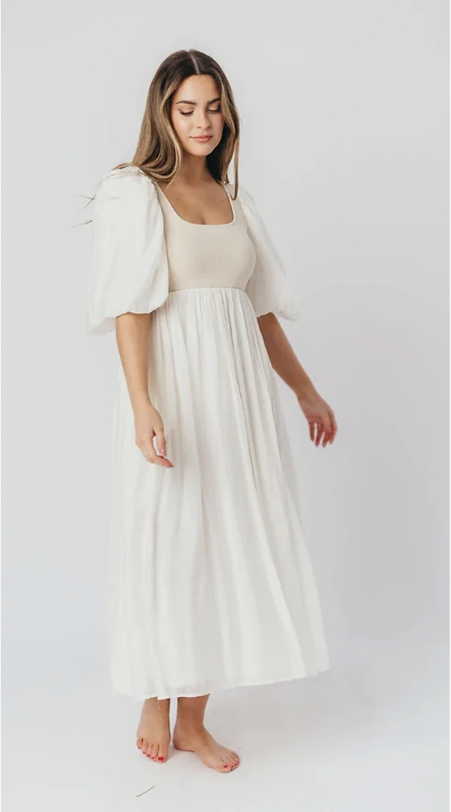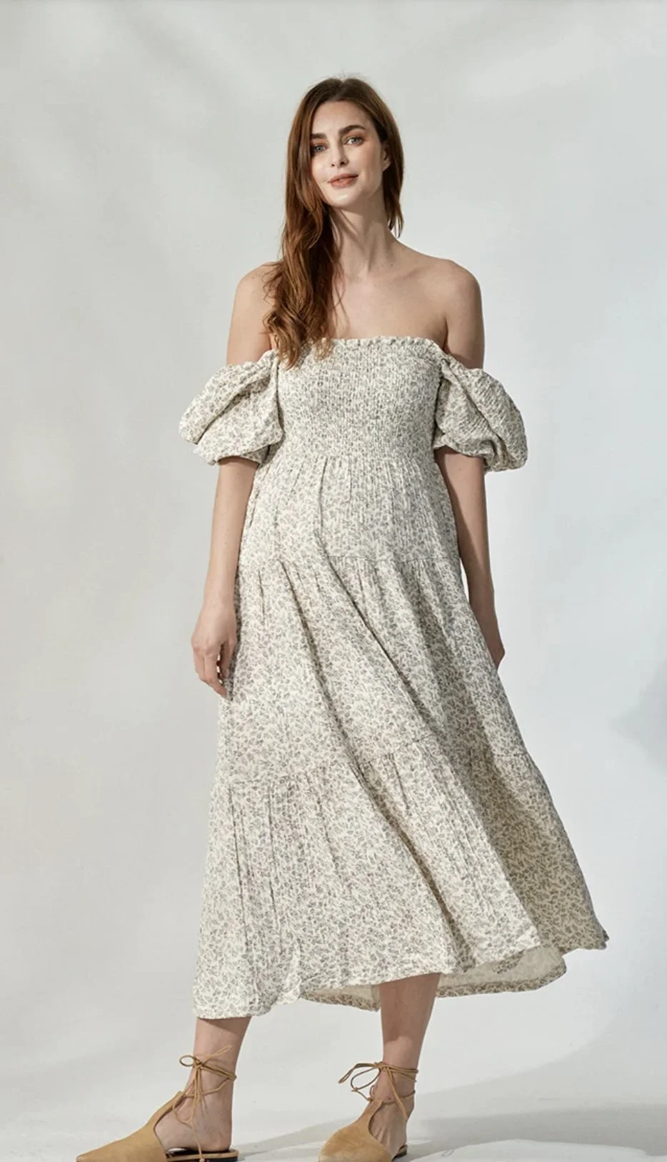 The Vivian midi dress in off-white can be worn on or off the shoulder. It’s bump and nursing friendly and flattering even if you had your babies years ago. this dress is flowy and feminine with a vintage feel.
