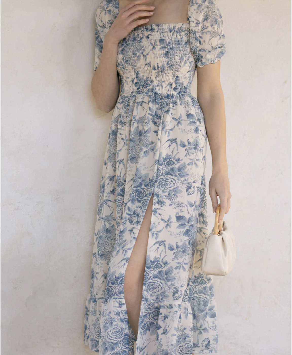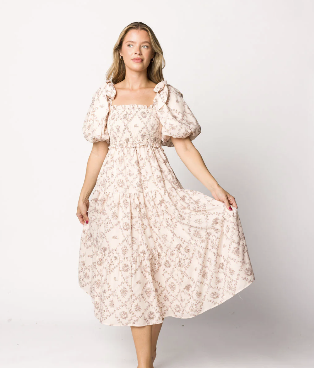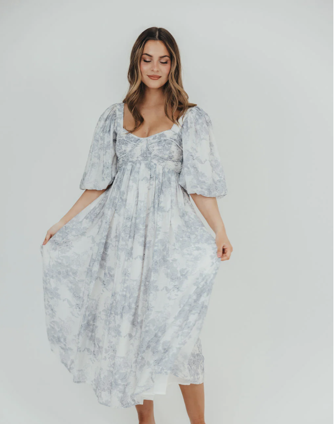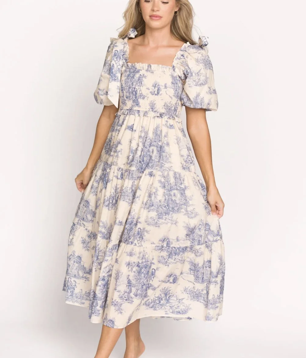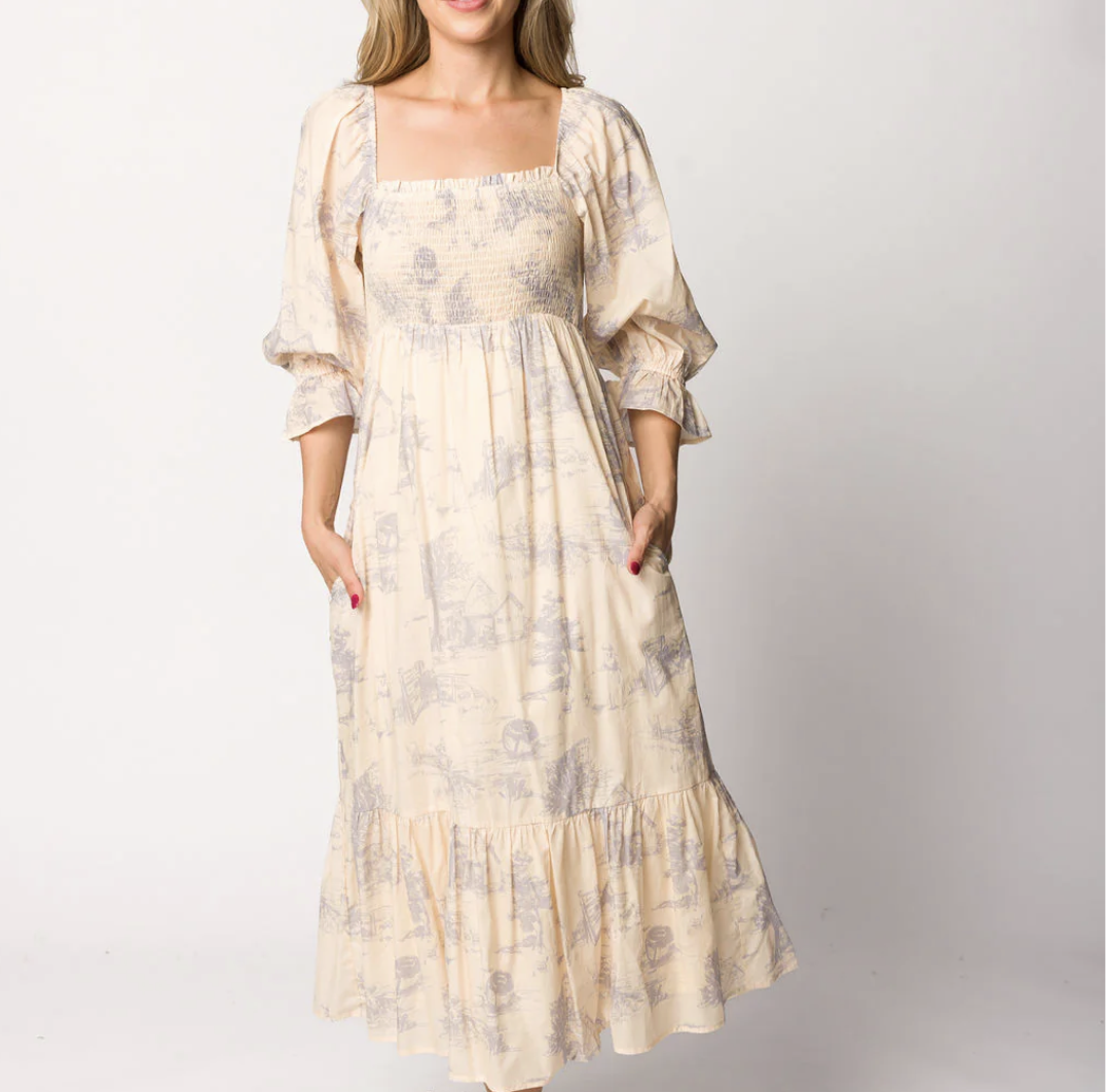 This smocked toile midi dress is bump and nursing friendly! Perfect for postpartum or any day!