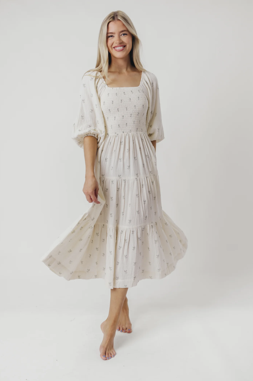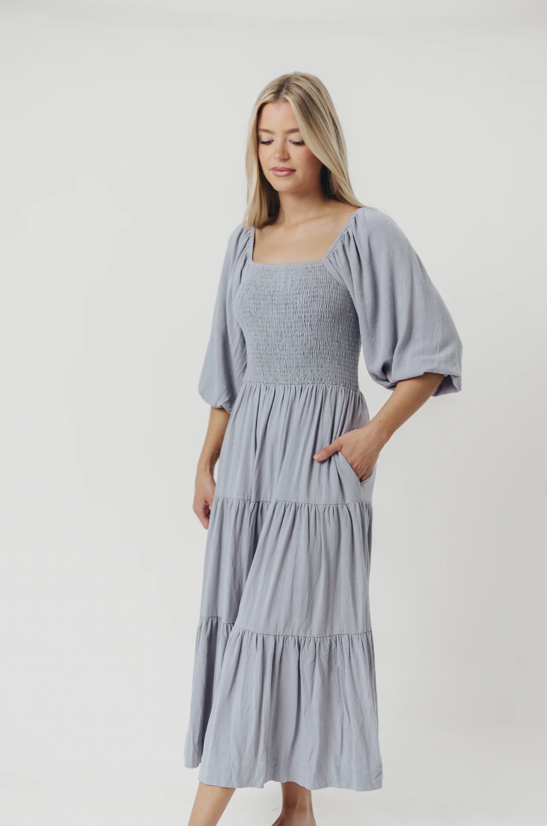 The Taylor Midi Dress is comfortable, flattering, and in a premium, natural fabric. This dress features an exquisitely smocked bodice, with a multi-tiered skirt and flattering 3/4 length sleeves. It’s bump friendly and nursing friendly, but still beautiful even if you had your babies years ago. It’s super stretchy, and can fit a range of sizes.
