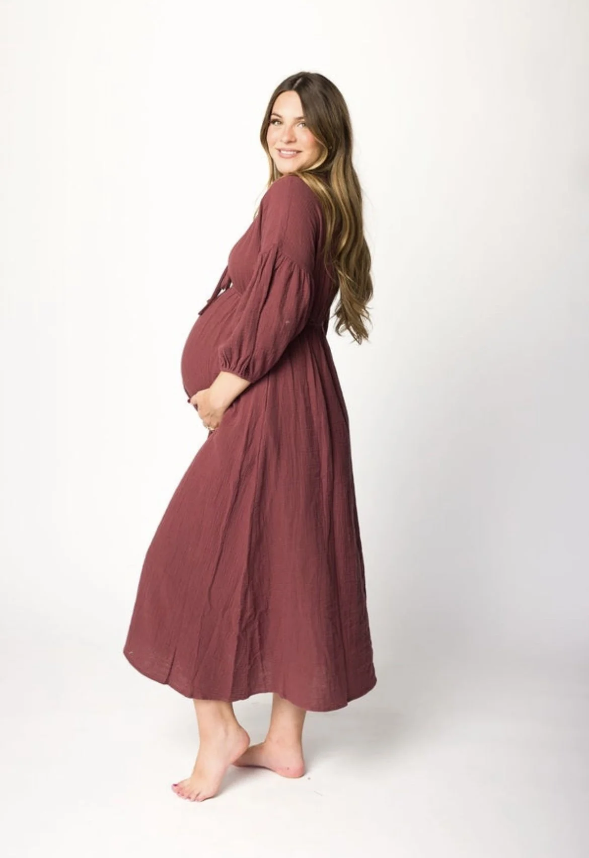 The Wren Maxi Dress features a beautiful square neckline, with short sleeves and a curve-skimming silhouette. This dress is bump friendly and nursing friendly. It would be perfect for fall photos or Christmas photos. I would not recommend for newborn photos (flowy is best for early postpartum).