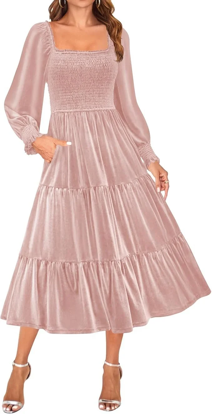 This stunning dusty rose midi dress is perfect for pregnancy, postpartum, and every day! I wore this dress for my own maternity photos! It has an extremely flattering fit. You can see a full blog post featuring this dress here.