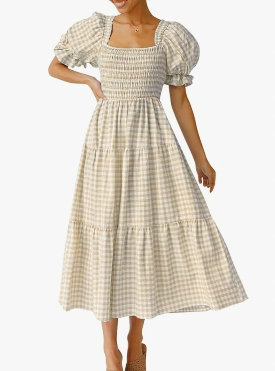 The Alice dress features a trendy gingham pattern in a beige color. This dress is a beautiful neutral color with the added interest of a pattern. This midi dress is bump friendly and nursing friendly while still being flattering for every day.