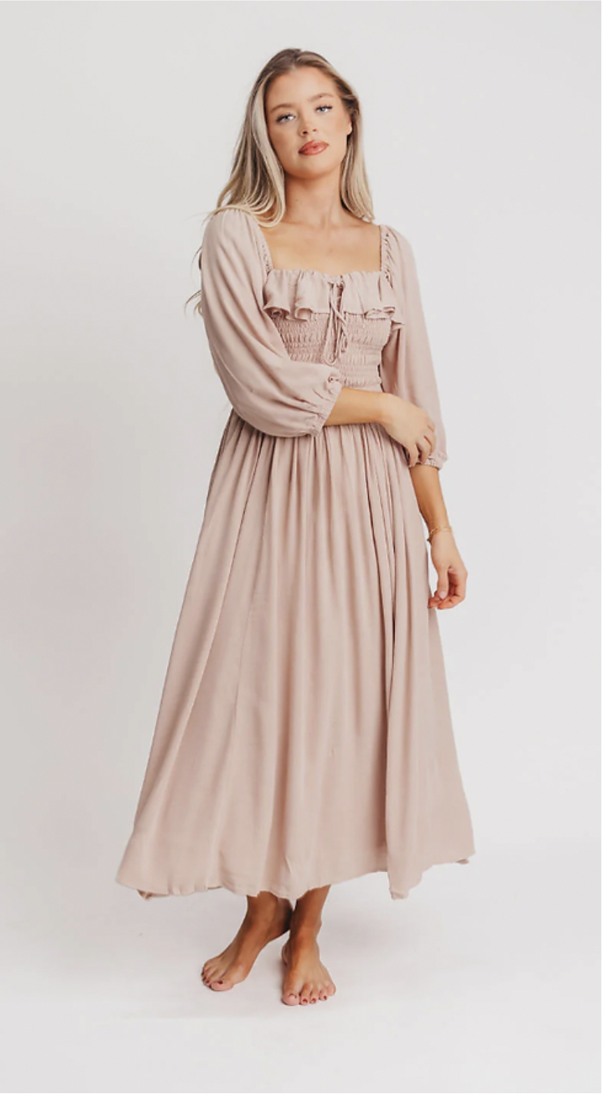The perfect taupe midi dress featuring puff sleeves and a smocked back for comfort. Can be worn on or off the shoulder. Perfect for maternity, newborn, or family photos! Supportive enough to not need a bra!