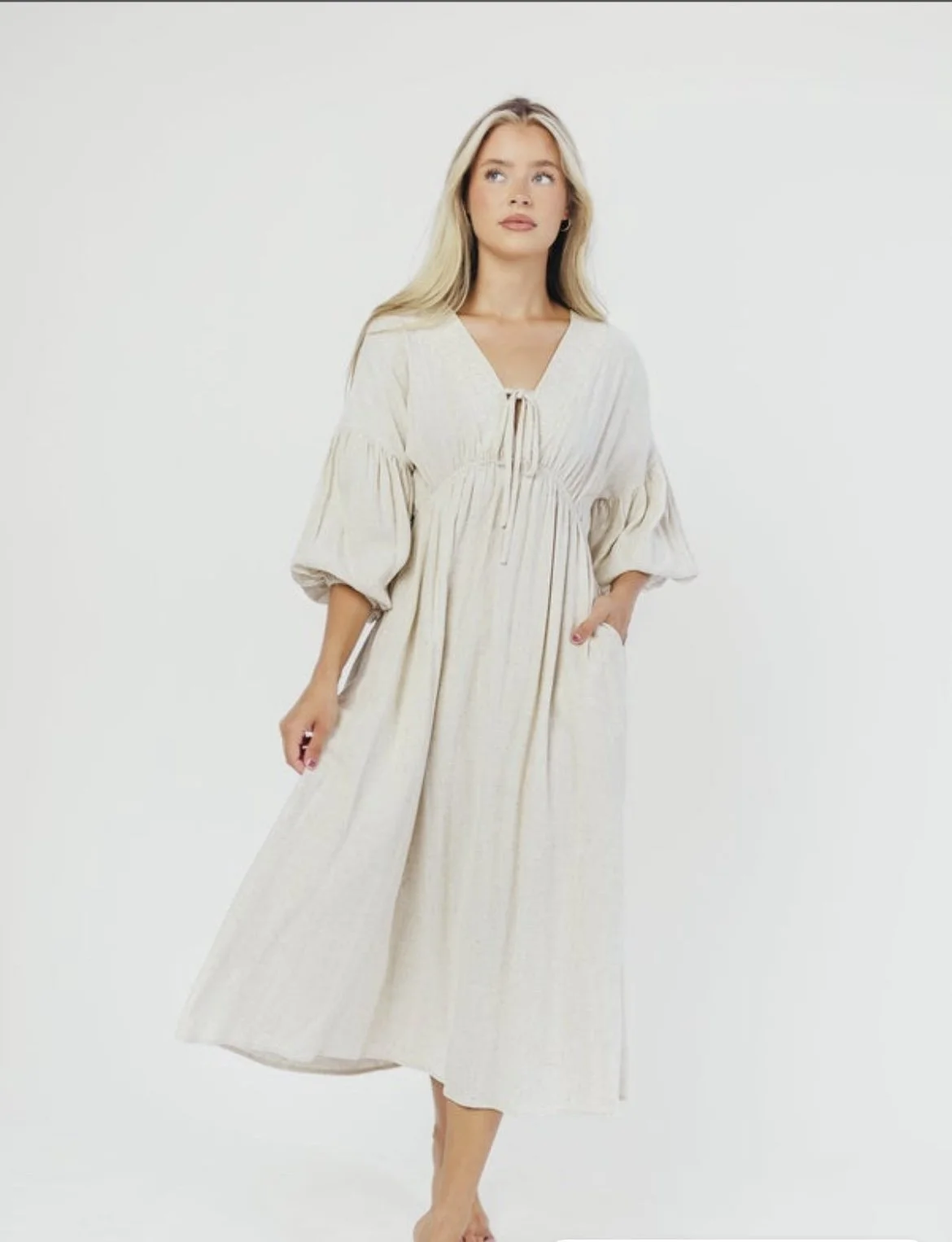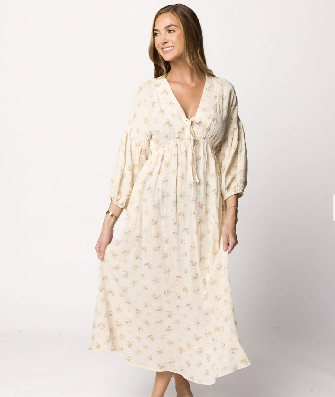 The Isla midi dress is the perfect neutral color. This timeless look will be beautiful for the walls of your homes and family albums that you pass down to your children. This dress is bump friendly, but not nursing friendly.